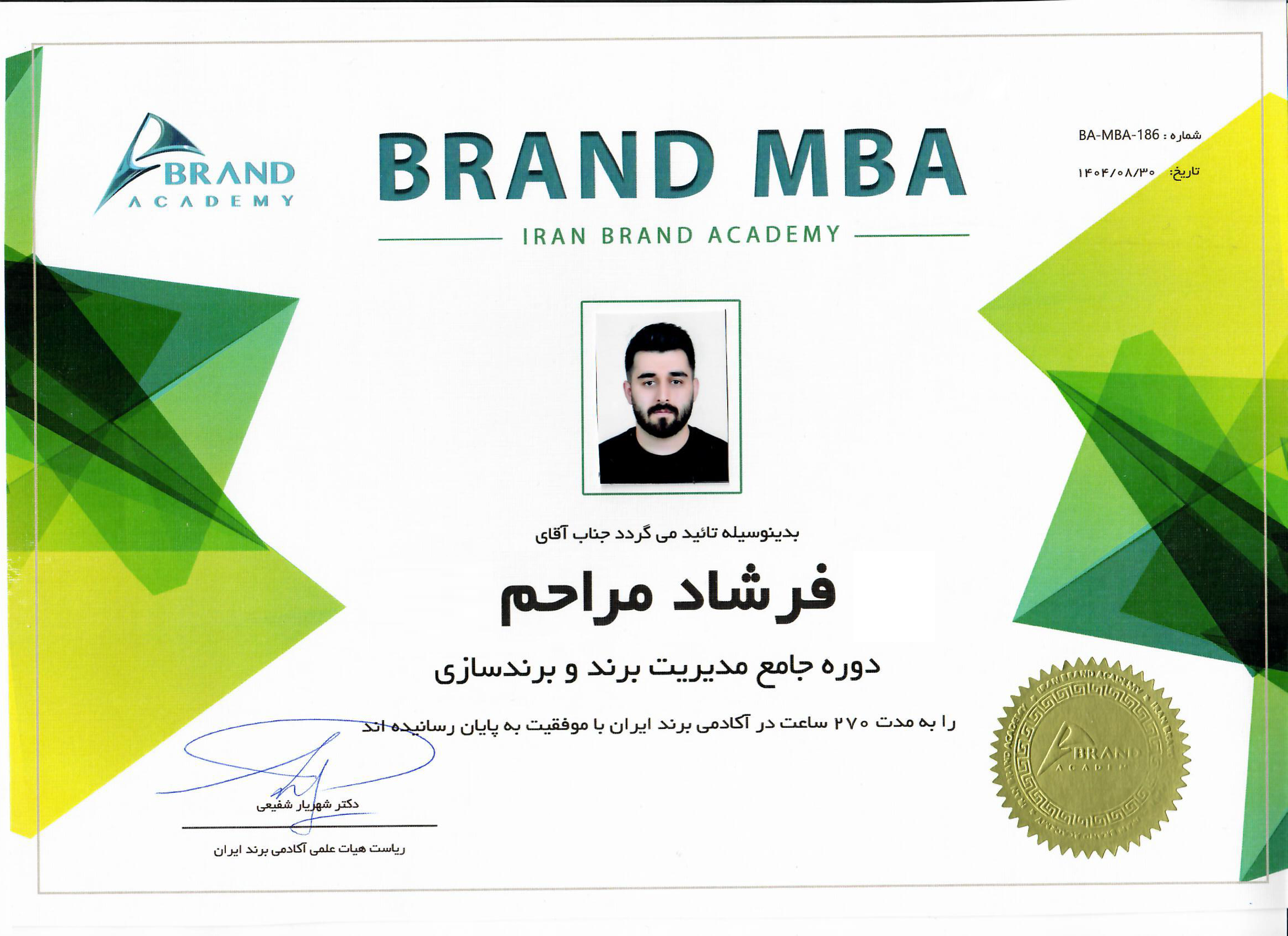 در سال ۱۴۰۳ در دوره MBA برند آکادمی برند ایران شرکت کردم و با موفقیت مدرک این دوره را دریافت نمودم. این تجربه ارزشمند به من کمک کرد تا نگاه عمیقتر و علمیتری نسبت به مباحث مدیریت برند به دست آورم و دانش خود را در زمینه استراتژیهای برندینگ، بازاریابی و توسعه کسبوکار تکمیل کنم.